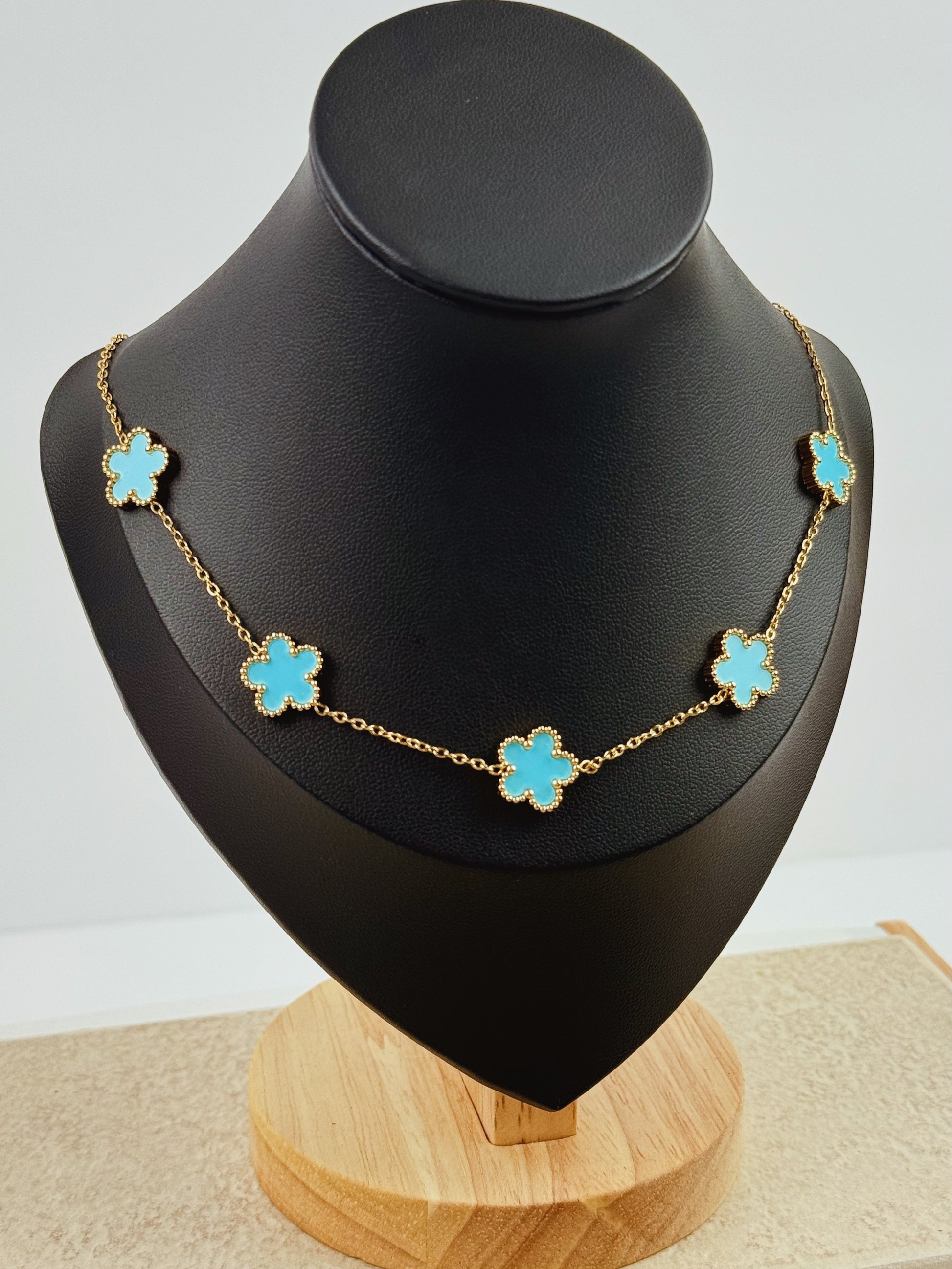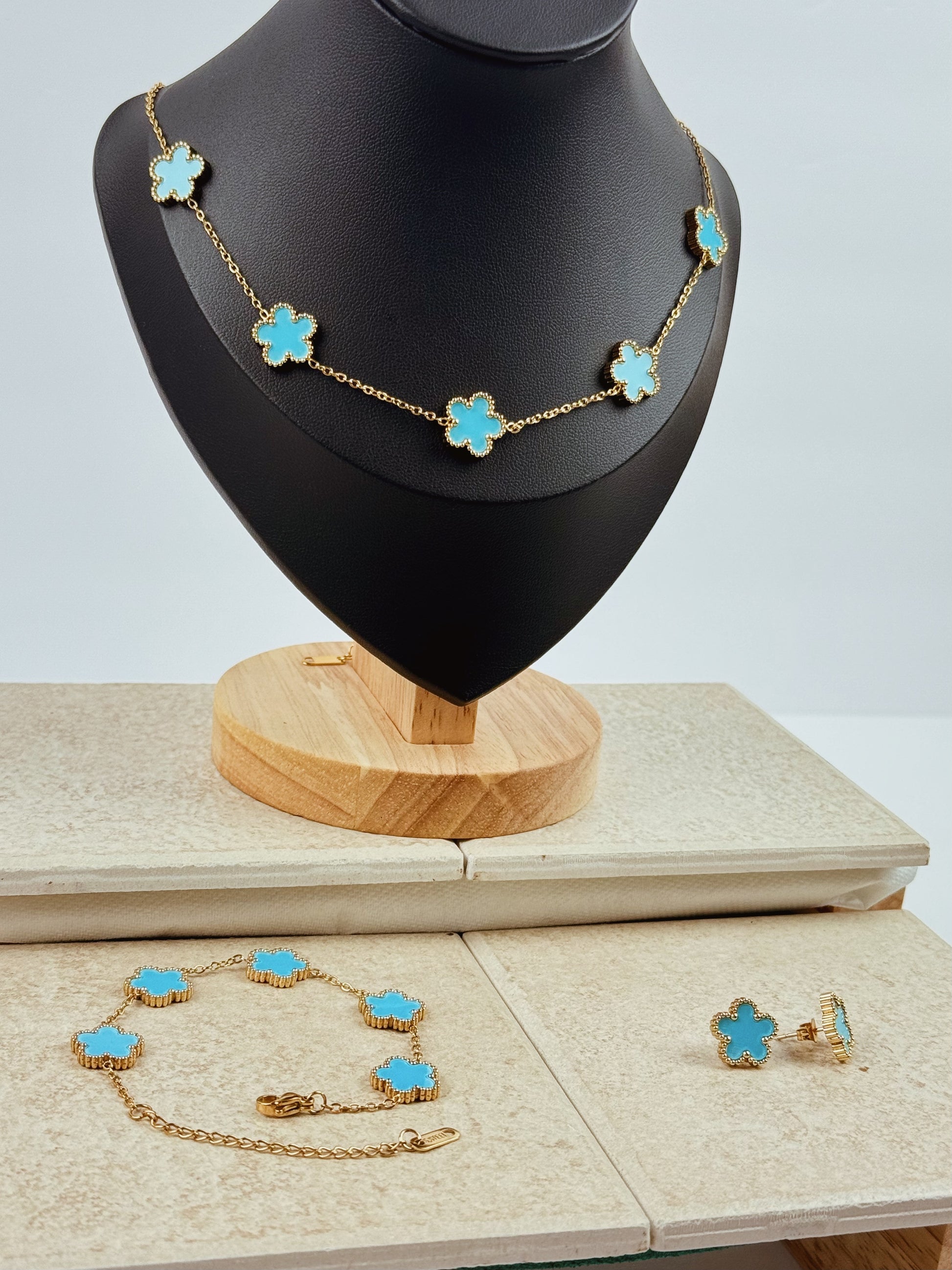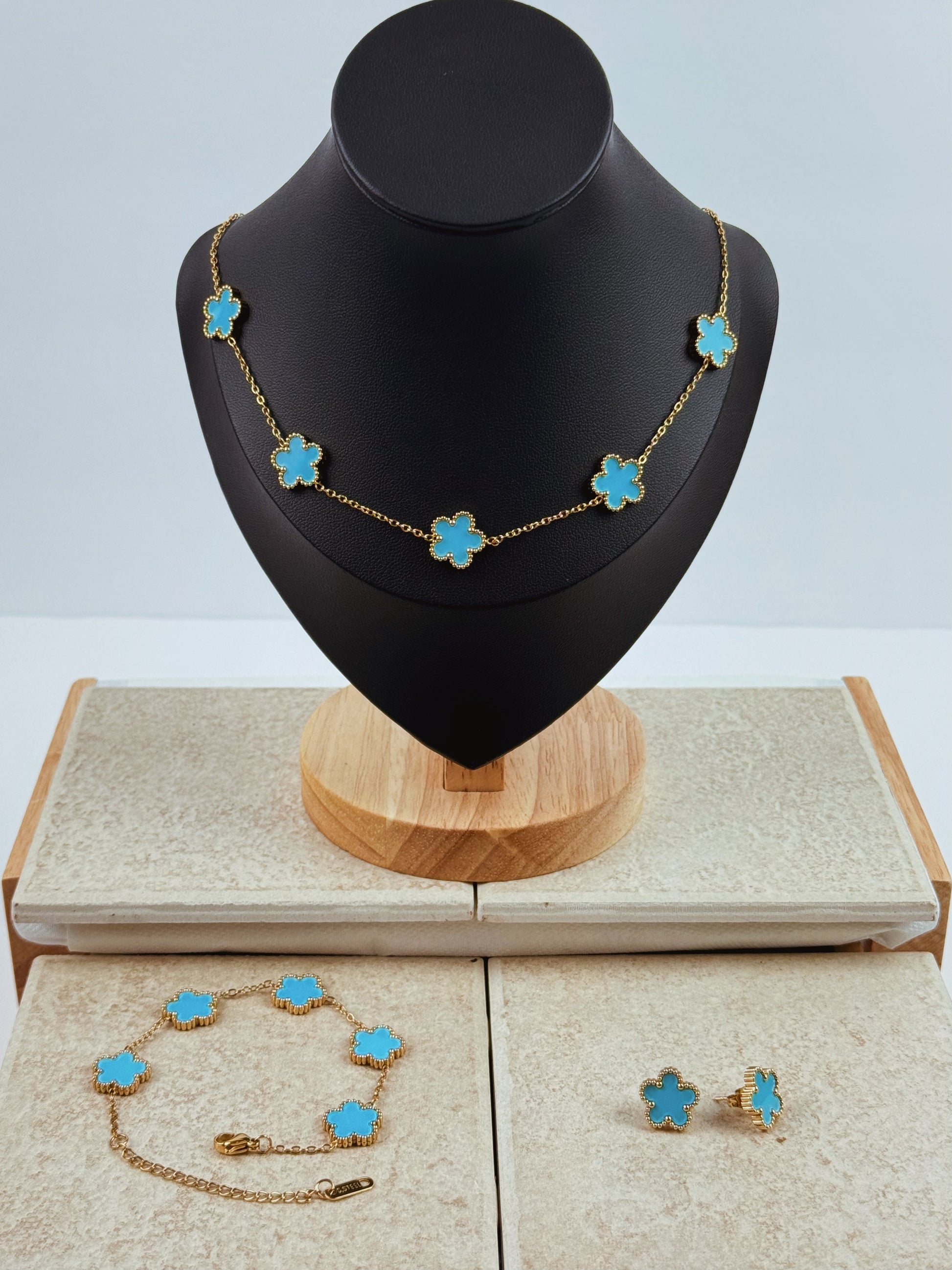 This Clover Sky Set includes a bracelet, necklace, and earrings all crafted from durable stainless steel. With its clover design, this elegant set adds a touch of sophistication to any outfit.
