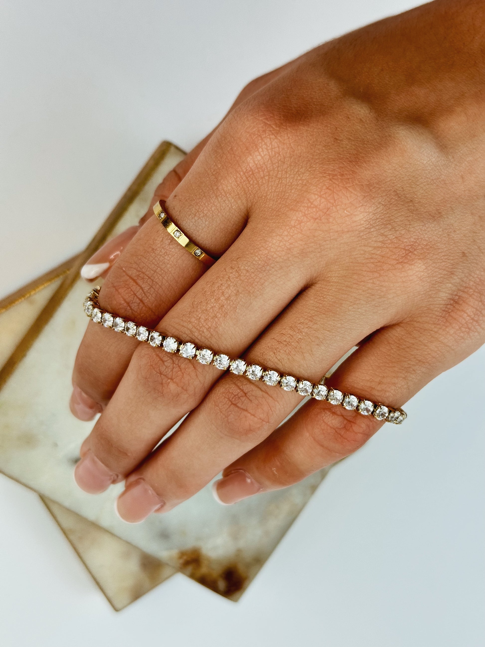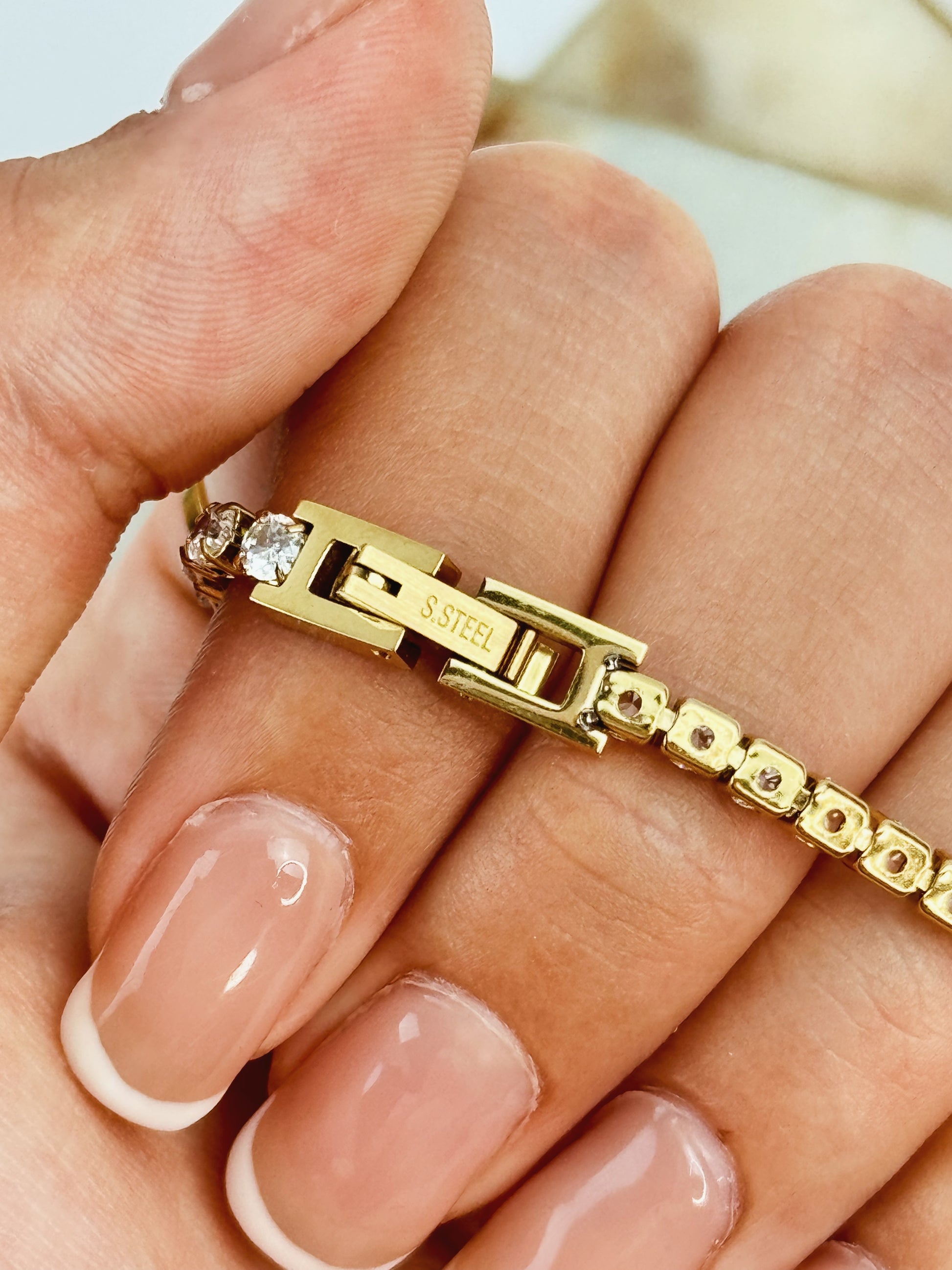 The Mia Tennis Bracelet is crafted from high-quality stainless steel, providing durability and a classic look.