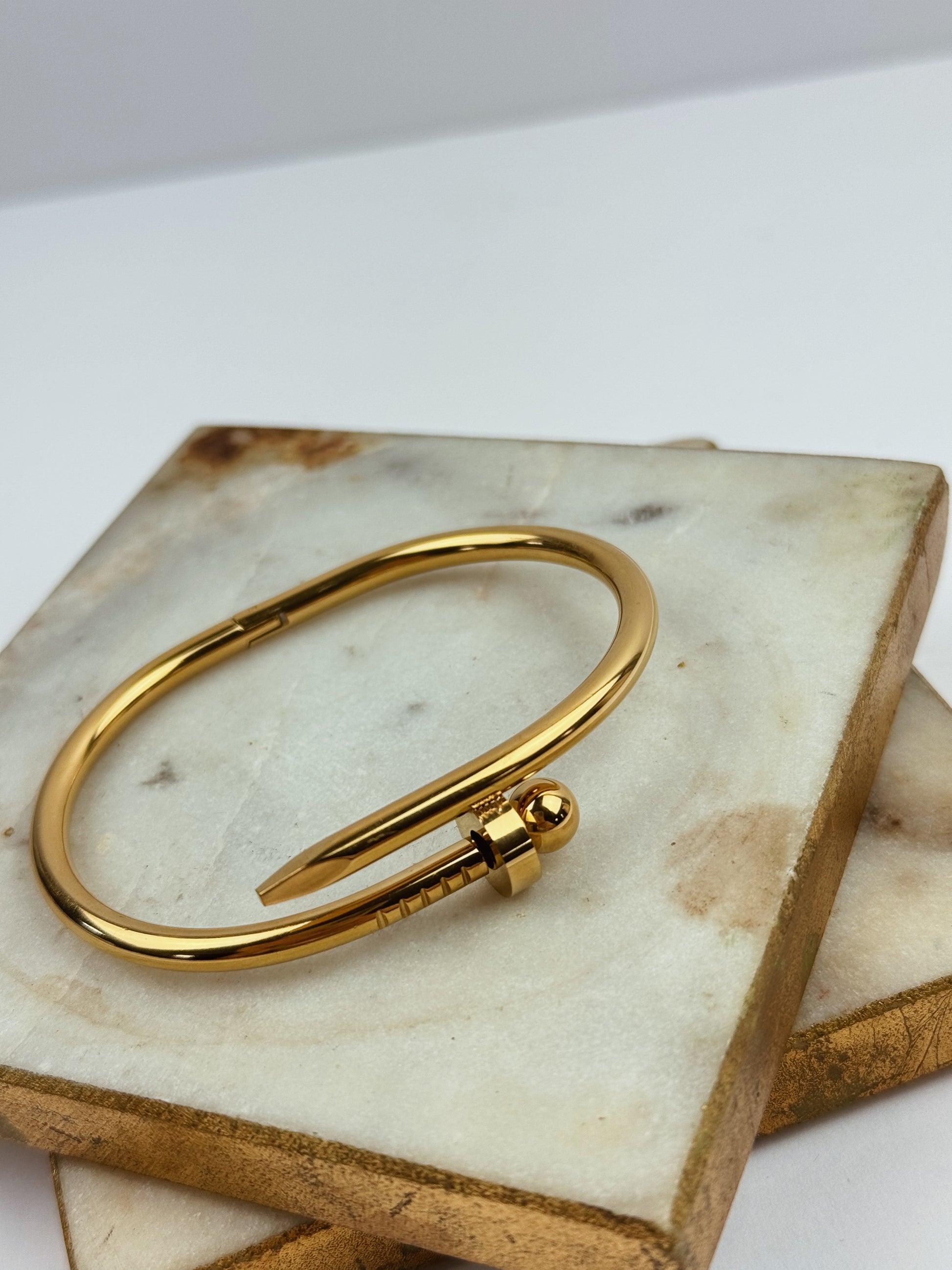 This Gold Nail bangle is a sleek and stylish addition to any wardrobe. Made of durable stainless steel and featuring a beautiful gold finish, this bangle will add a touch of elegance to any outfit.